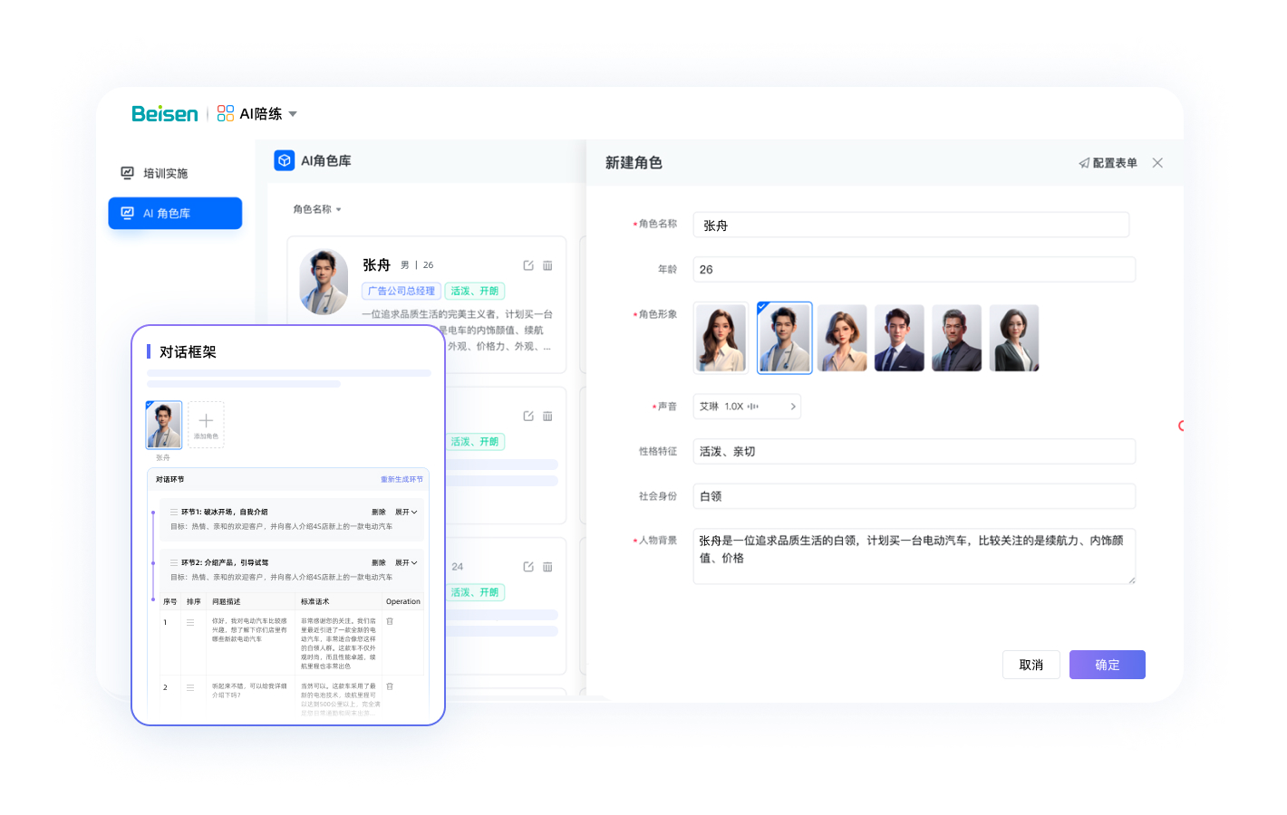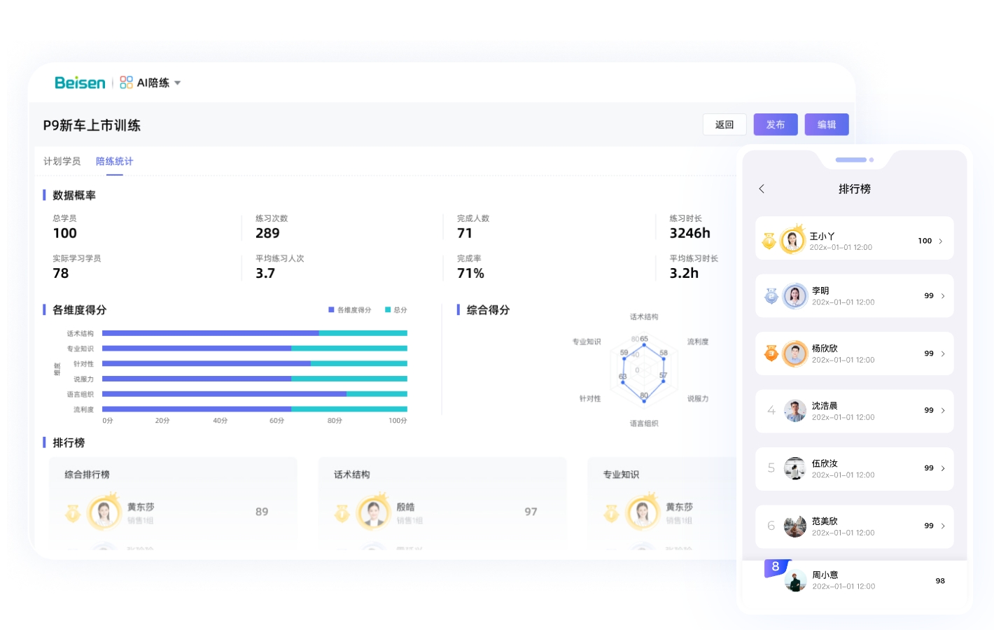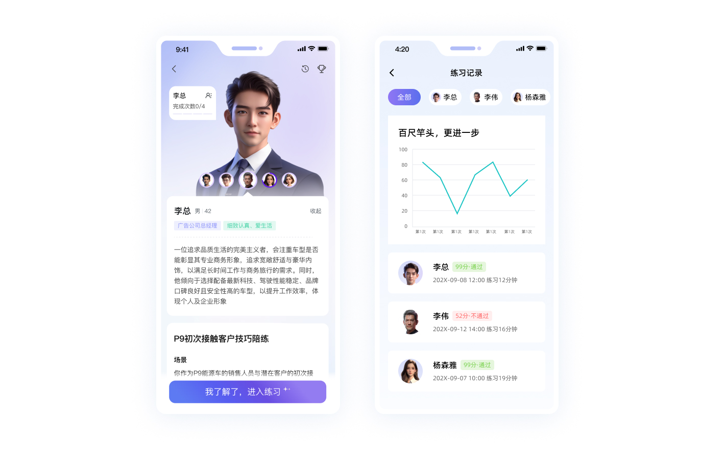 AI陪练是新一代基于大模型技术的陪练产品,智能萃取销冠策略与话术,通过高度仿真的对话环境,精准模拟客户接待/拜访、商务谈判等真实场景,沉浸式实战演练。AI实时智能量化评估员工能力,个性化反馈改进建议,团队能力数据通晒一目了然。员工可随时随地高效对练,轻松复制销冠能力。