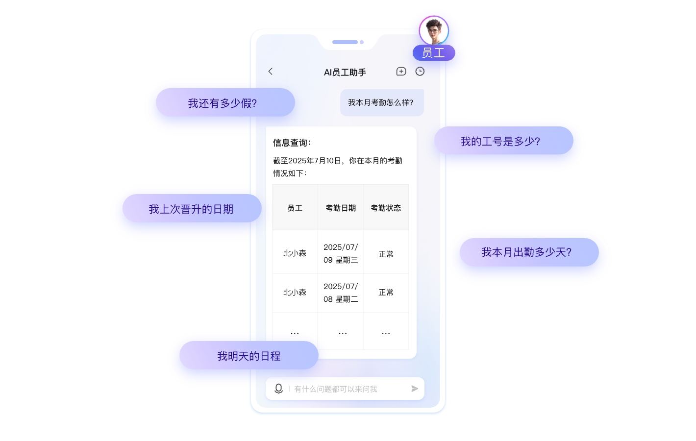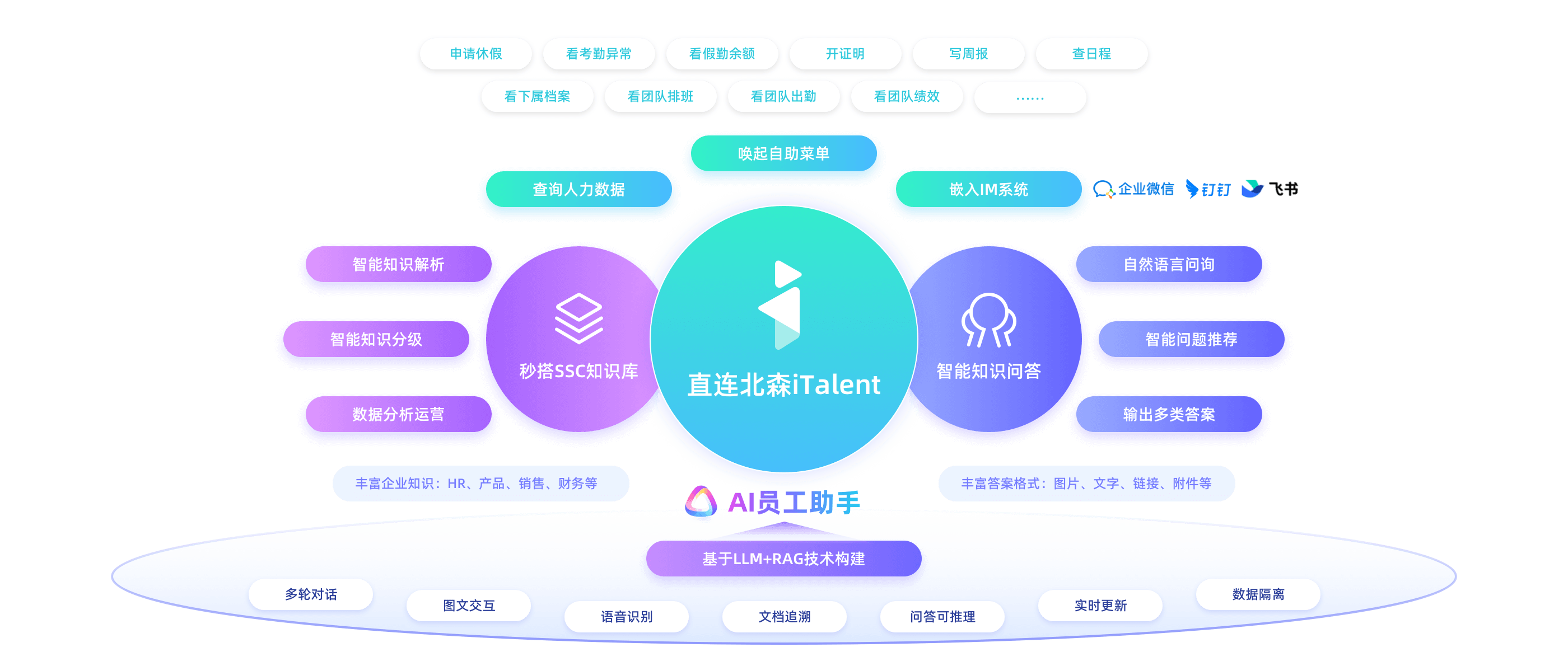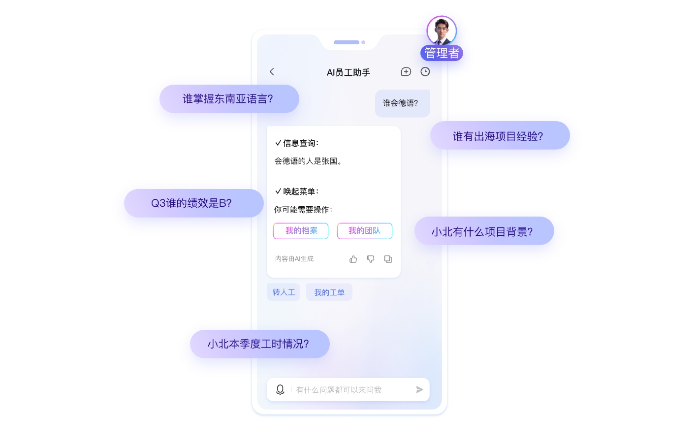 AI员工助手是一款基于生成式AI大模型的员工服务机器人,支持一键上传企业各类文档,AI智能解析,秒搭企业SSC知识库,直连aoa体育官网iTalent系统,唤醒业务菜单,查询自己和团队的信息,颠覆员工自助体验