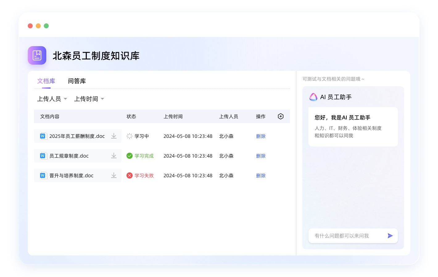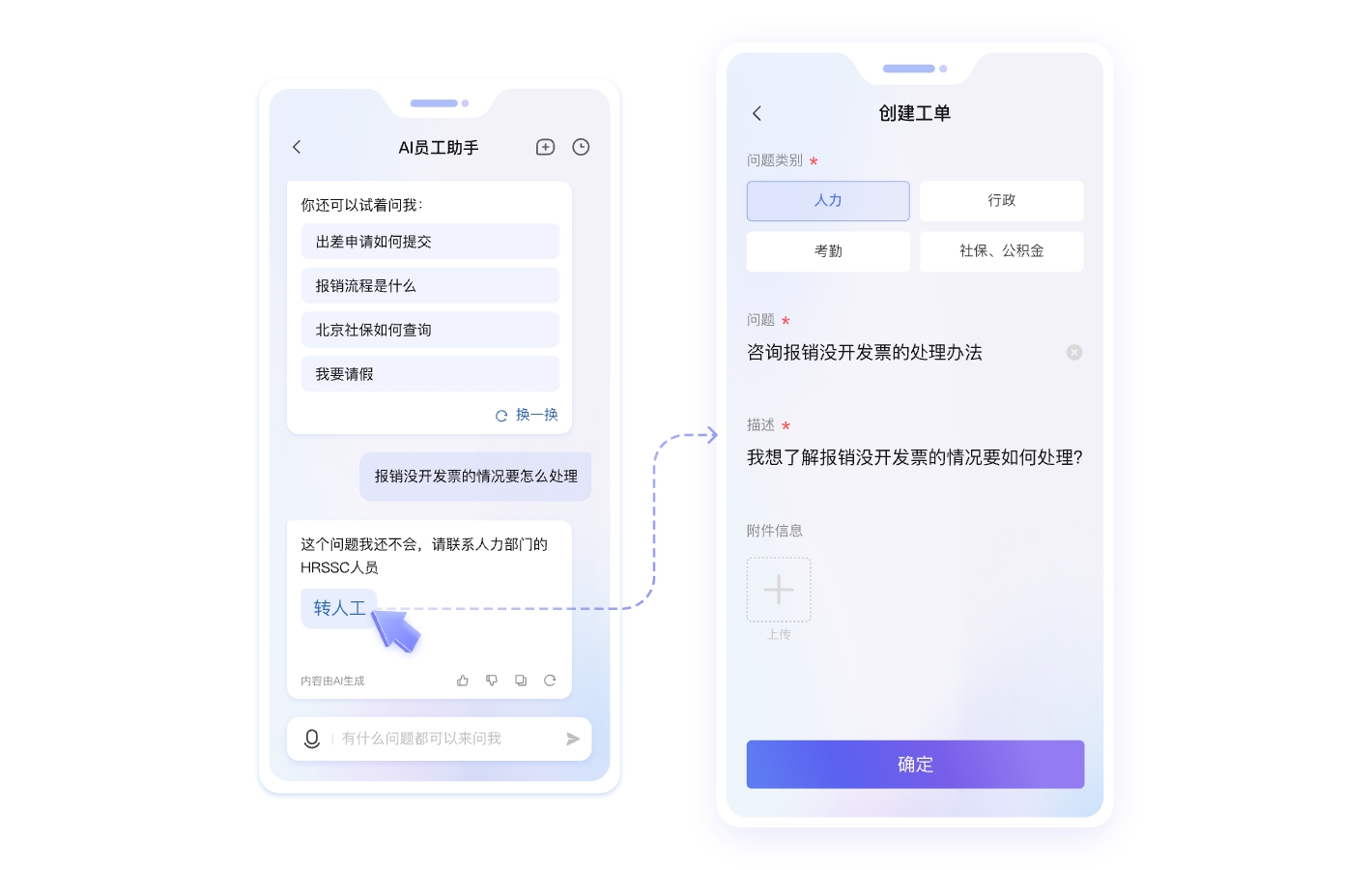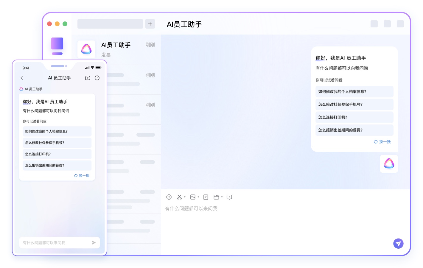 AI员工助手是一款基于生成式AI大模型的员工服务机器人,支持一键上传企业各类文档,AI智能解析,秒搭企业SSC知识库,直连aoa体育官网iTalent系统,唤醒业务菜单,查询自己和团队的信息,颠覆员工自助体验