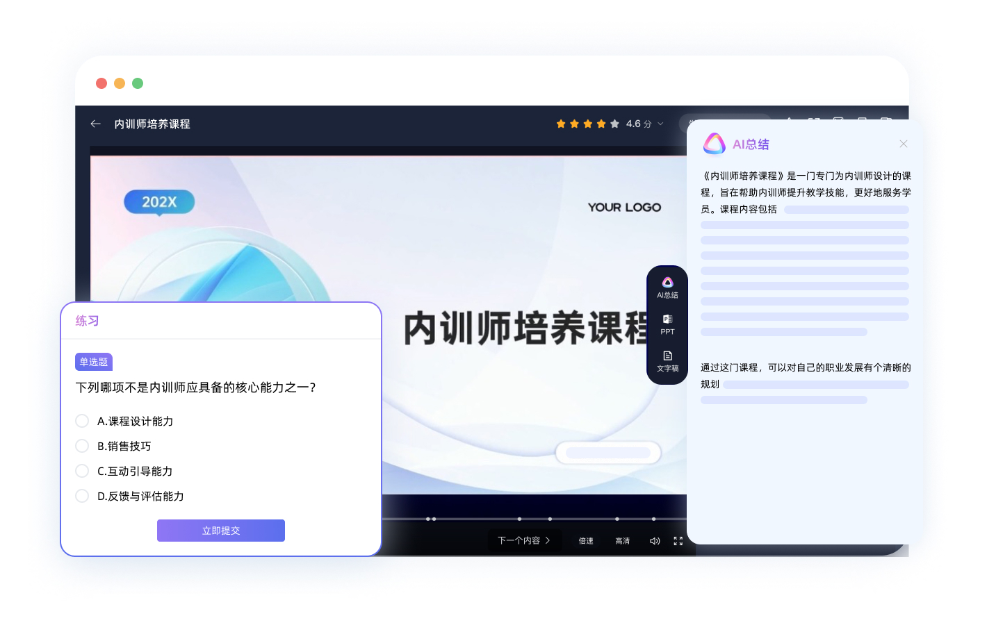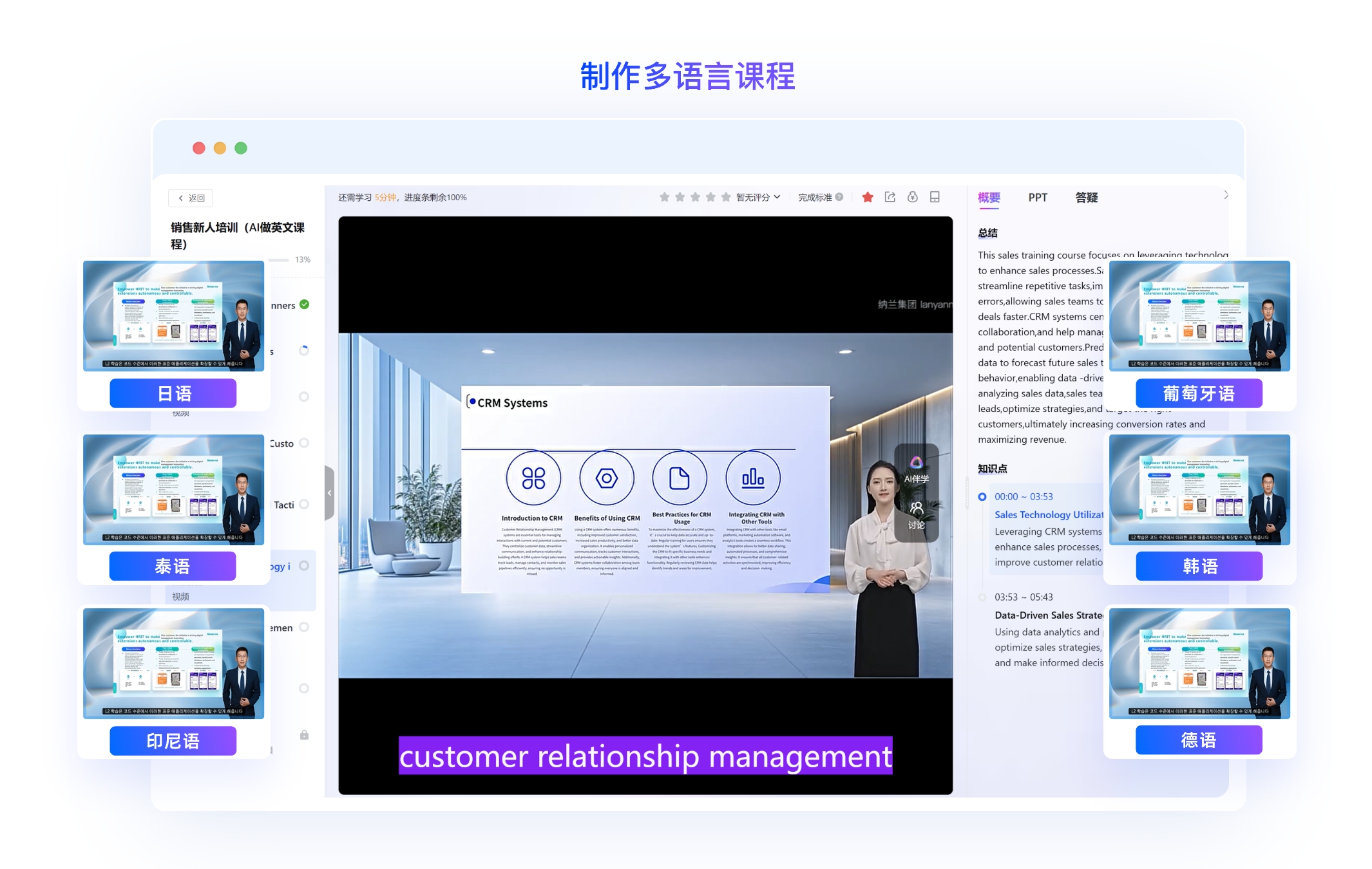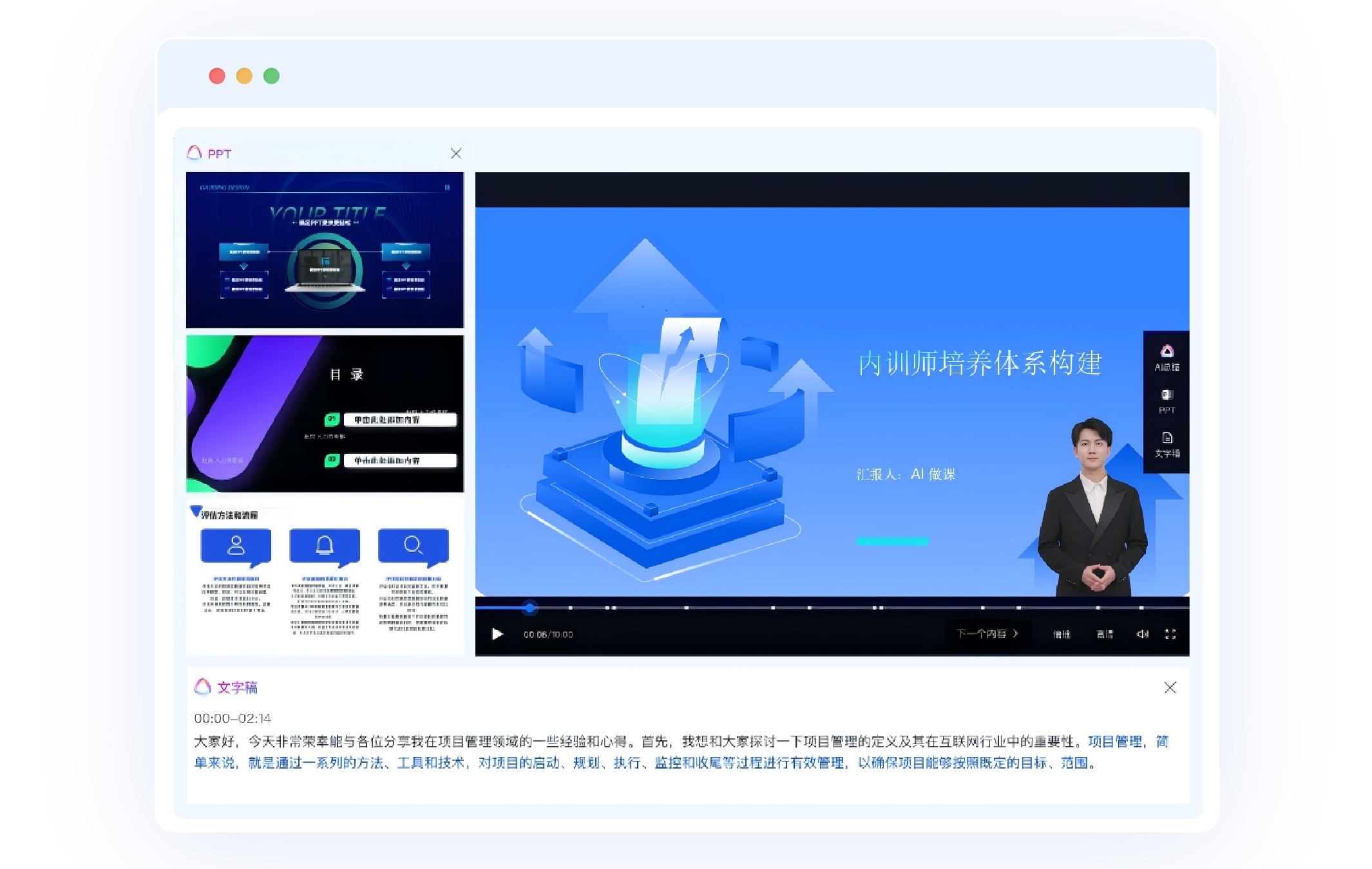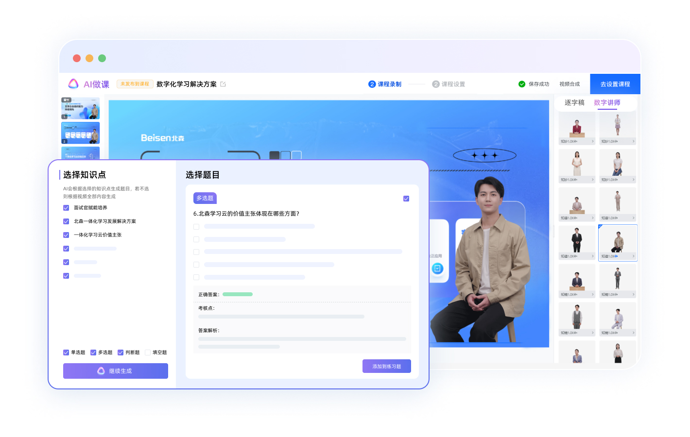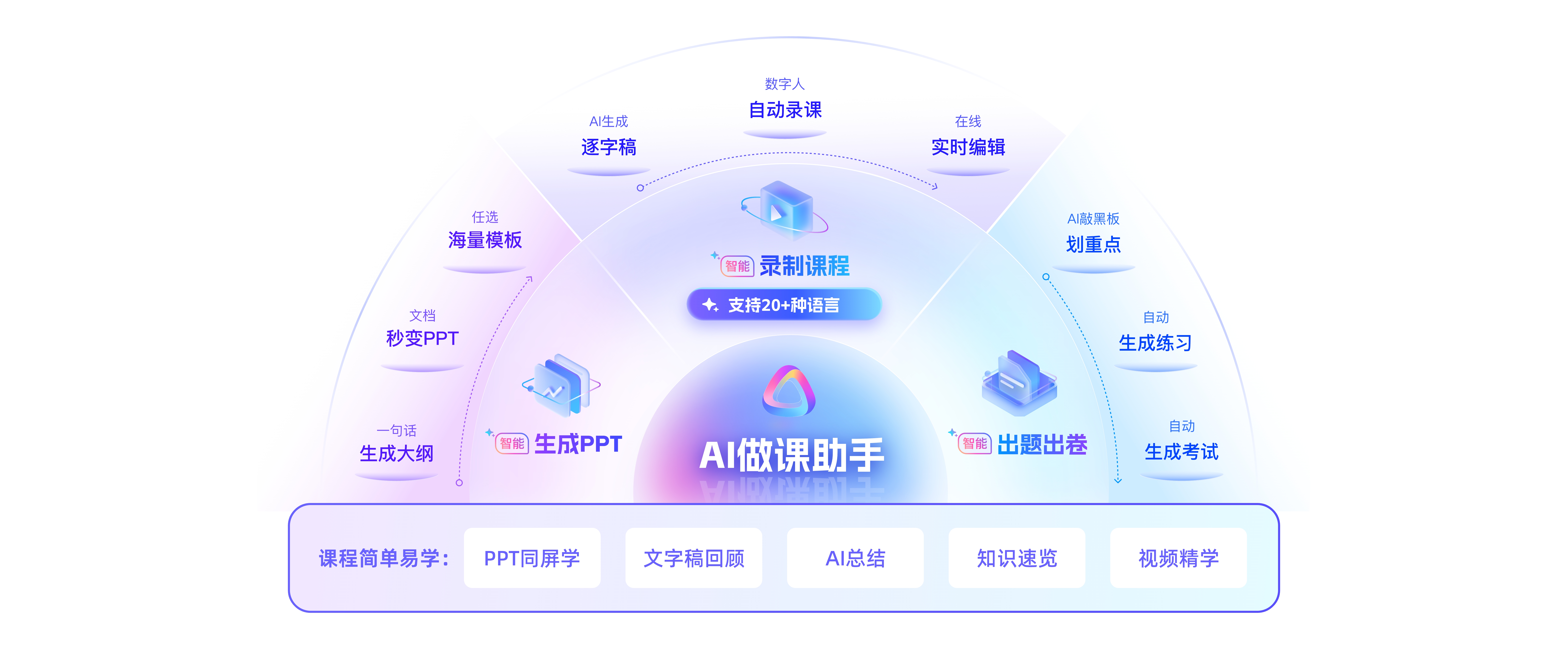 AI做课助手是生成PPT、数字人智能录制、智能出题出卷等功能于一体的综合性工具,支持多语言课程,萃取企业精华知识,人人为师。