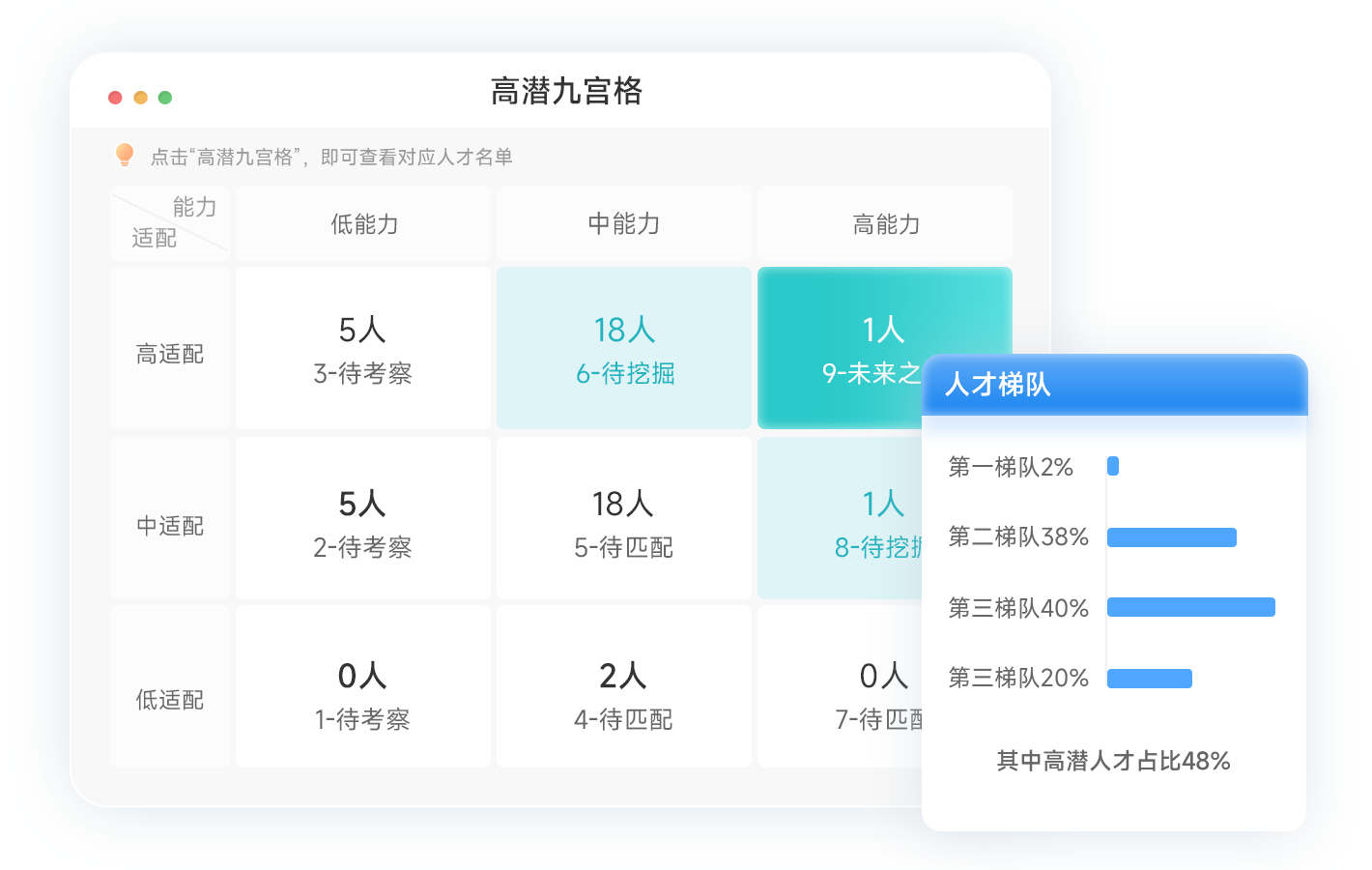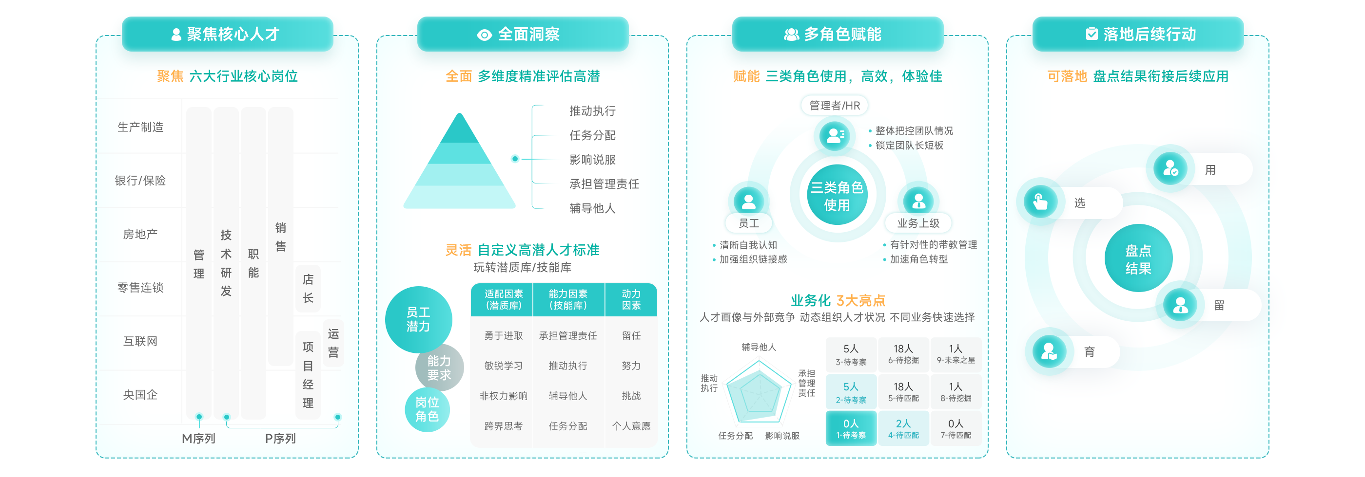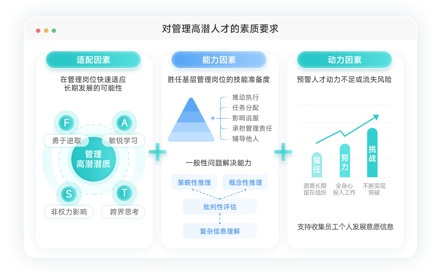 通过建立企业高潜人才标准,从适配、能力、动力多角度,全方位考察和挑选优秀人才,为竞聘评估提供更多参考信息