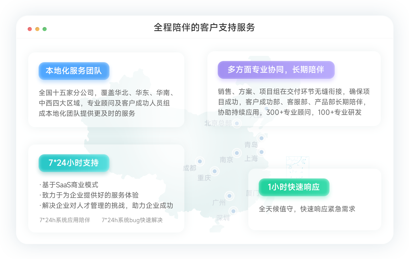 基于产品体系应用之上,提供应用、专业和增值的服务体系,解决企业在人才和管理各方面的挑战,助力企业获得成功