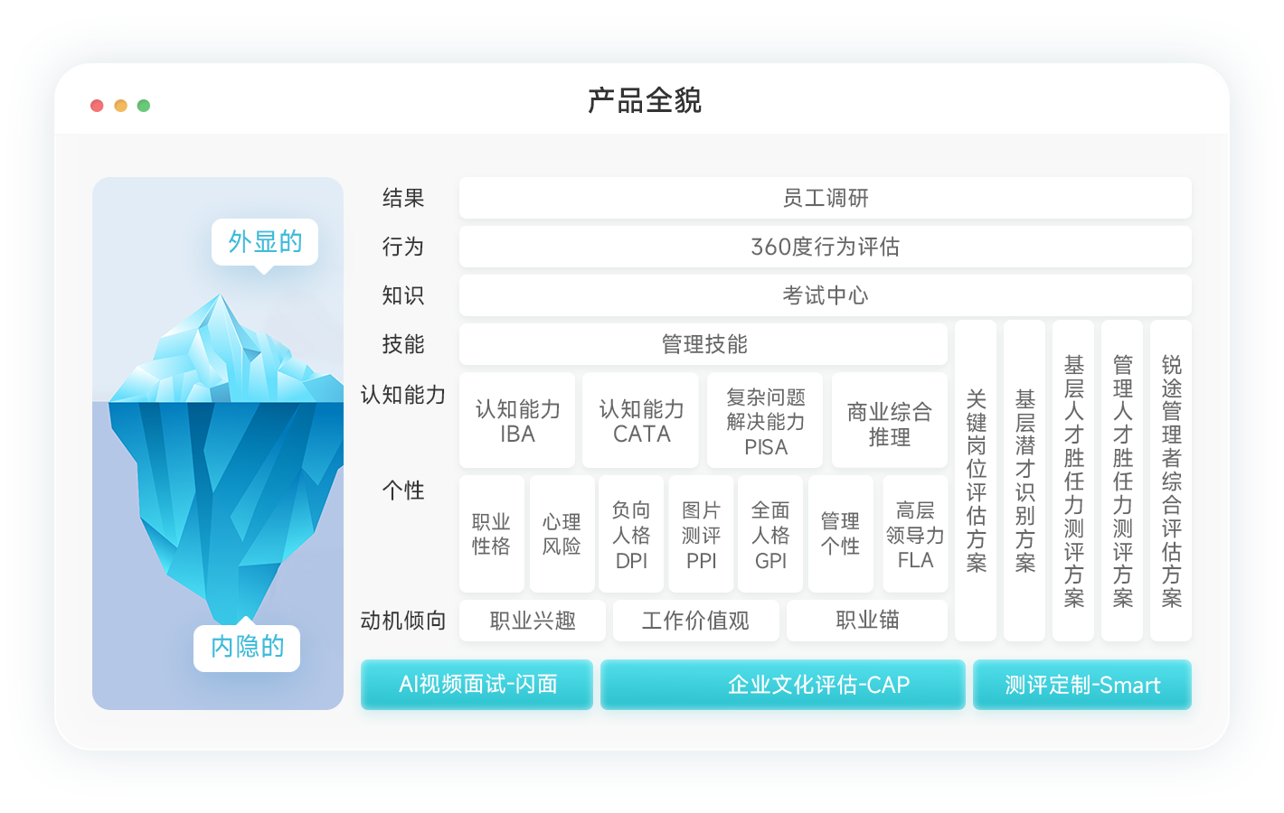 有机整合多样化测评工具,全面覆盖人才评估冰山模型的上下各个层面