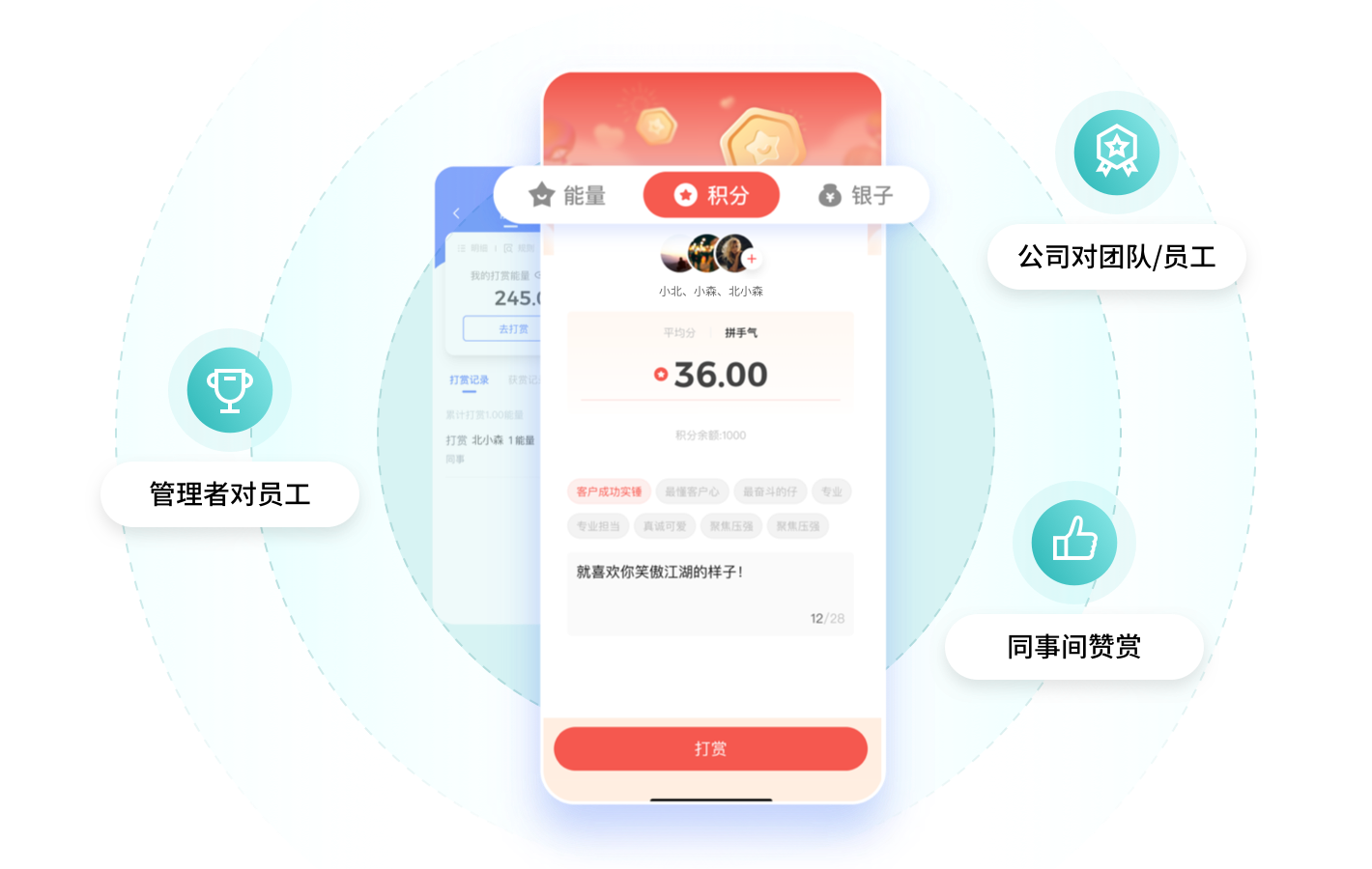 多样化打赏互动 ,在多种业务场景中认可员工,表达心意