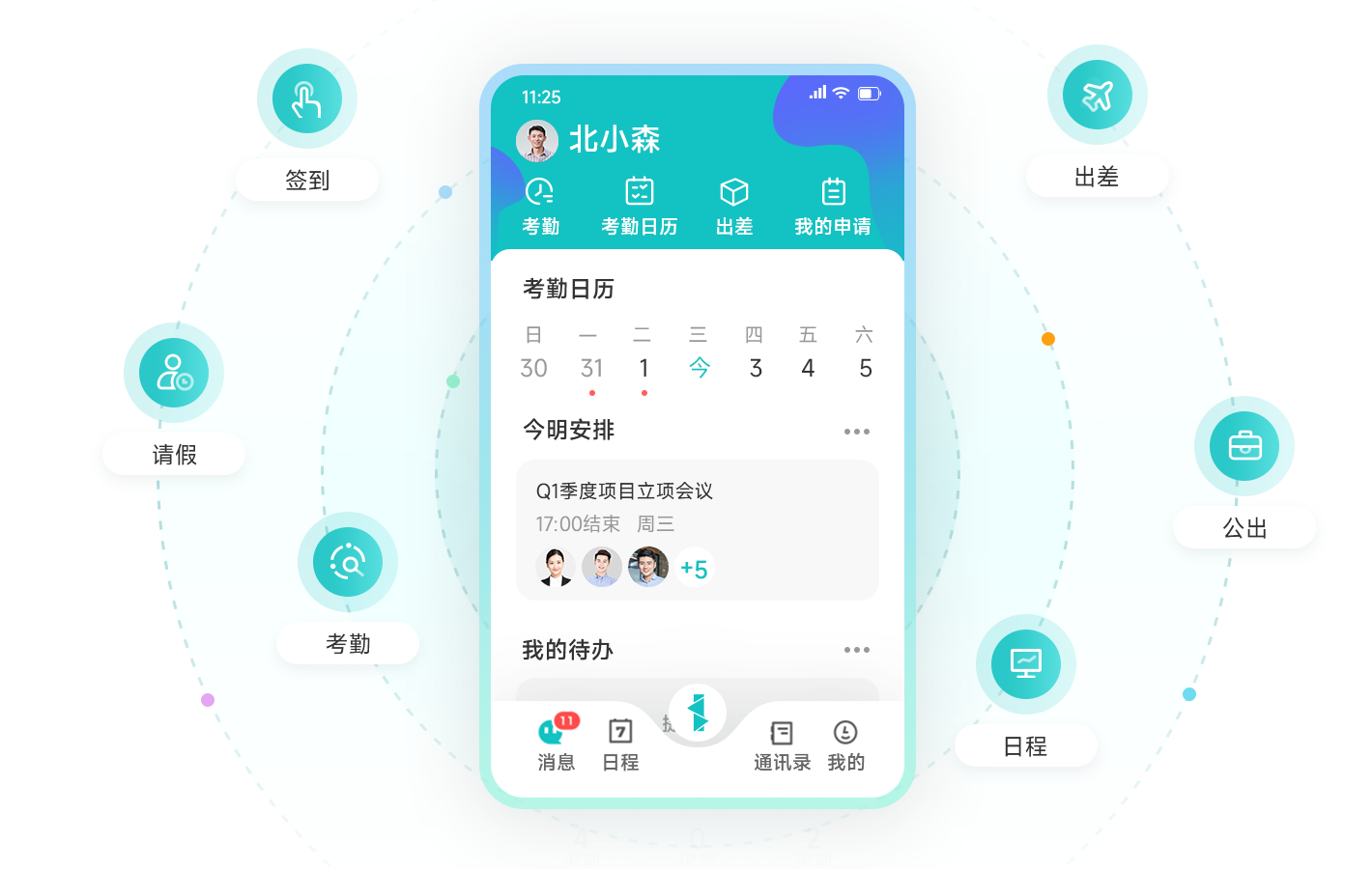 员工移动端随时打卡、补签、请假、出差等,操作便捷