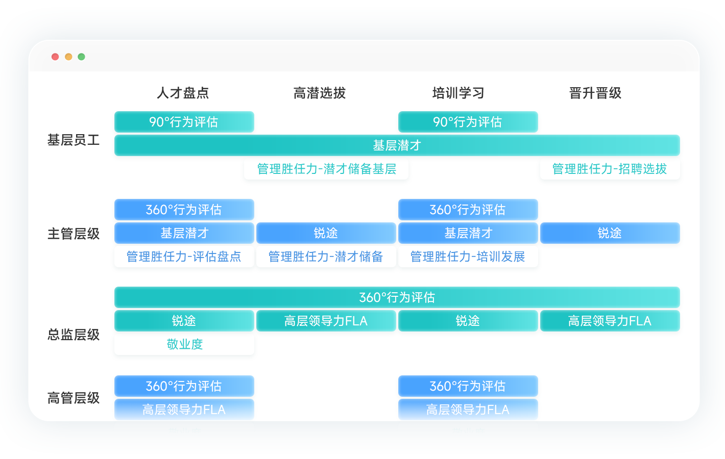 提供全面的人才评估工具和在线解决方案,帮助企业落地人才盘点、梯队建设、团队诊断等人才管理工作