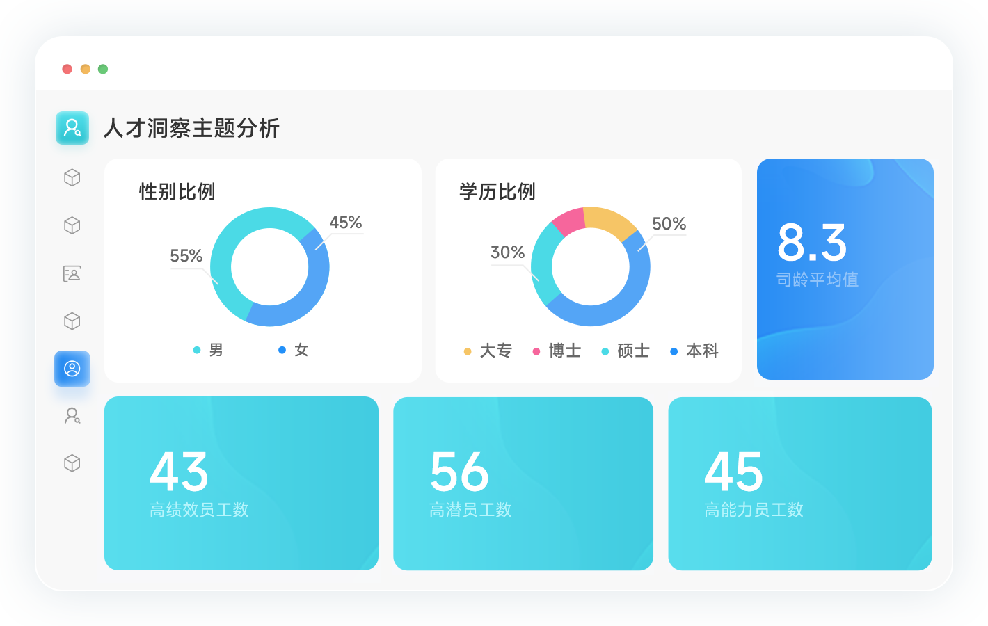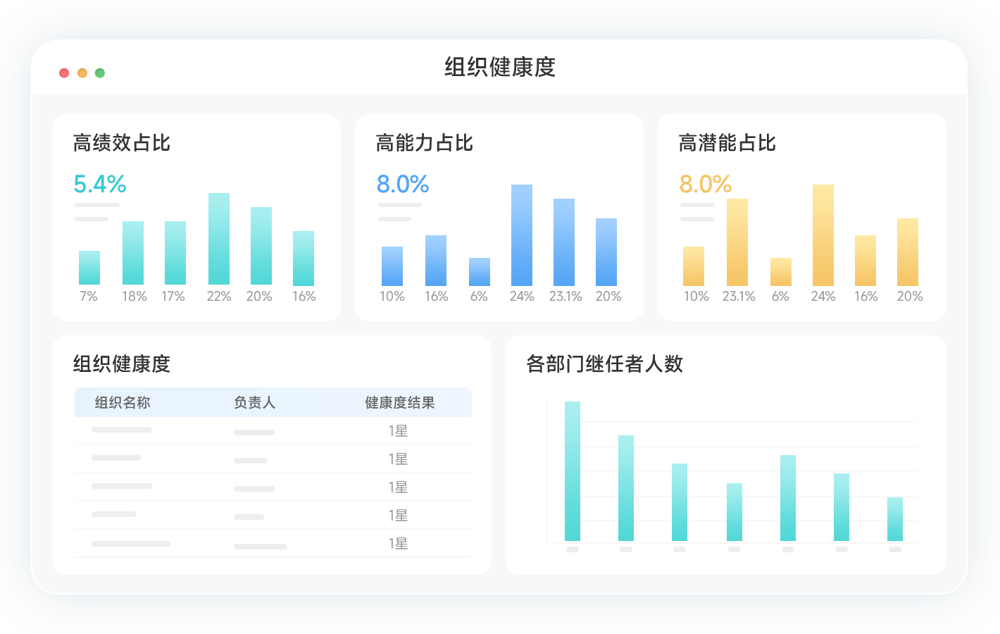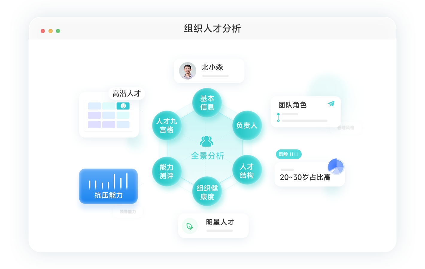 集合盘点/测评/人员信息等数据,从负责人胜任度/人才结构/人才质量等维度分析呈现,输出组织人才综合分析报告