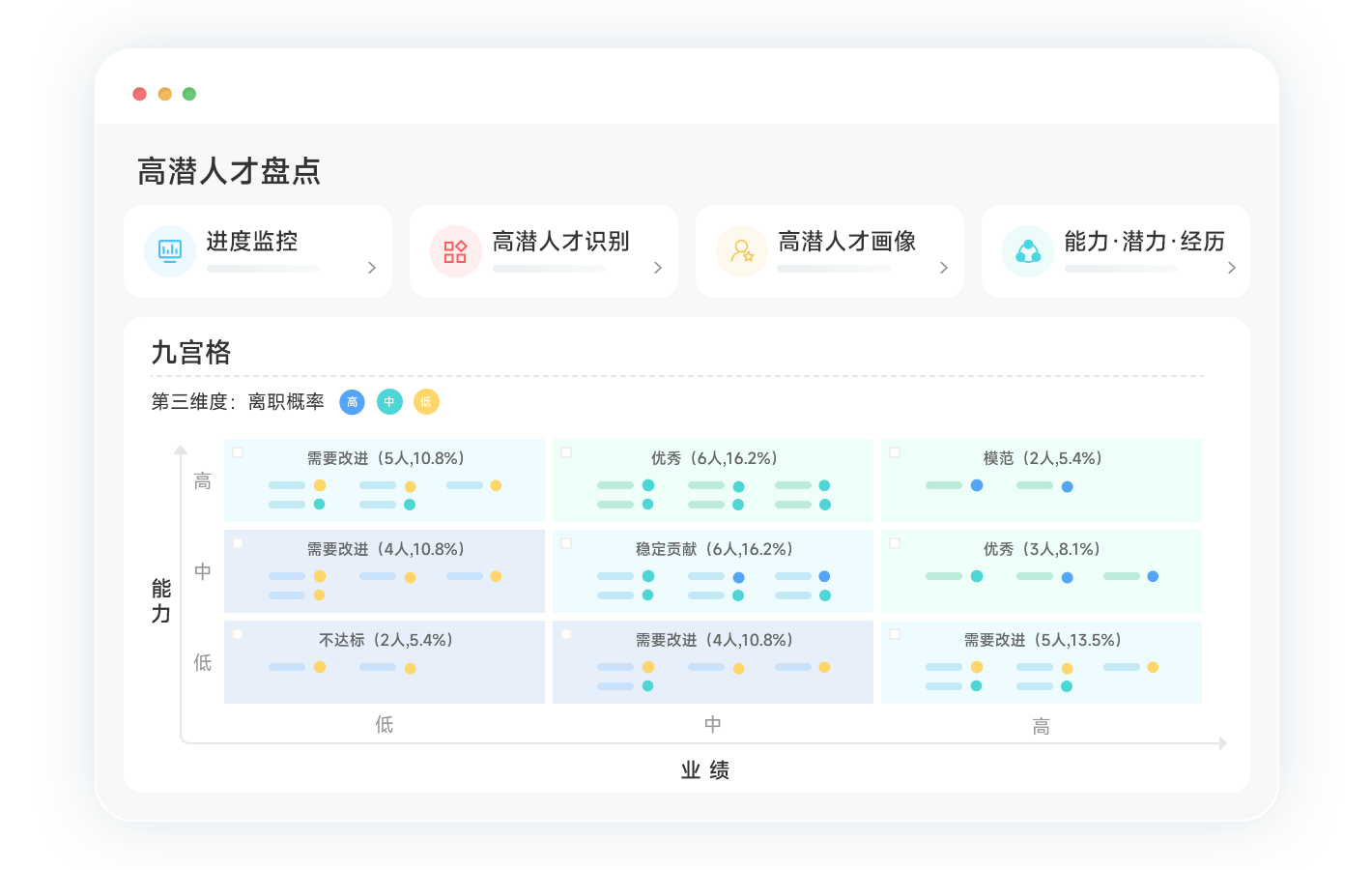 综合性盘点报告,支持盘点落位、人才标签多方式检索人才,盘点成果可视可用