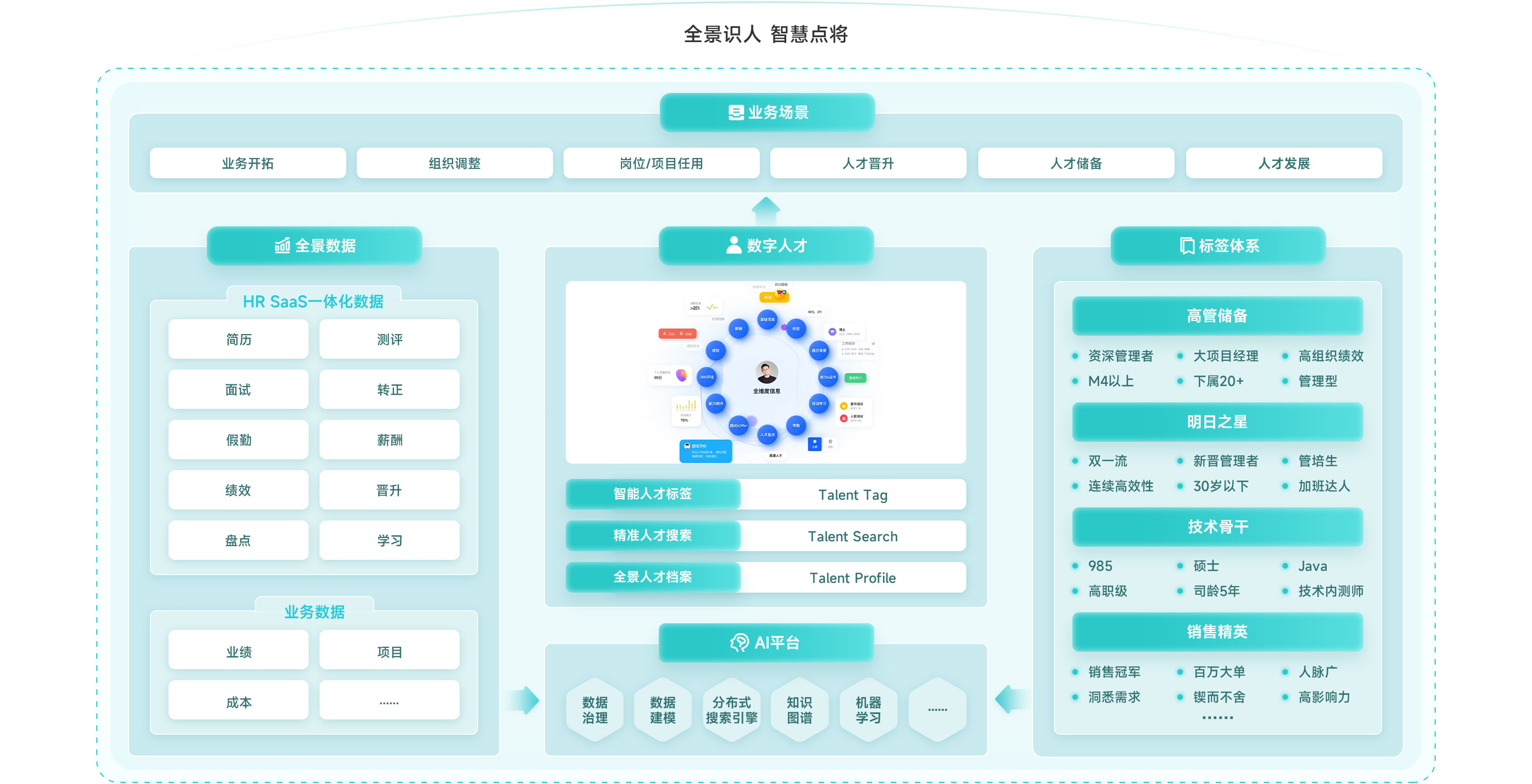 基于一体化HR SaaS全景数据,aoa体育官网人才管理能力沉淀的标签体系,应用智能AI算法打造的智慧人才识别系统