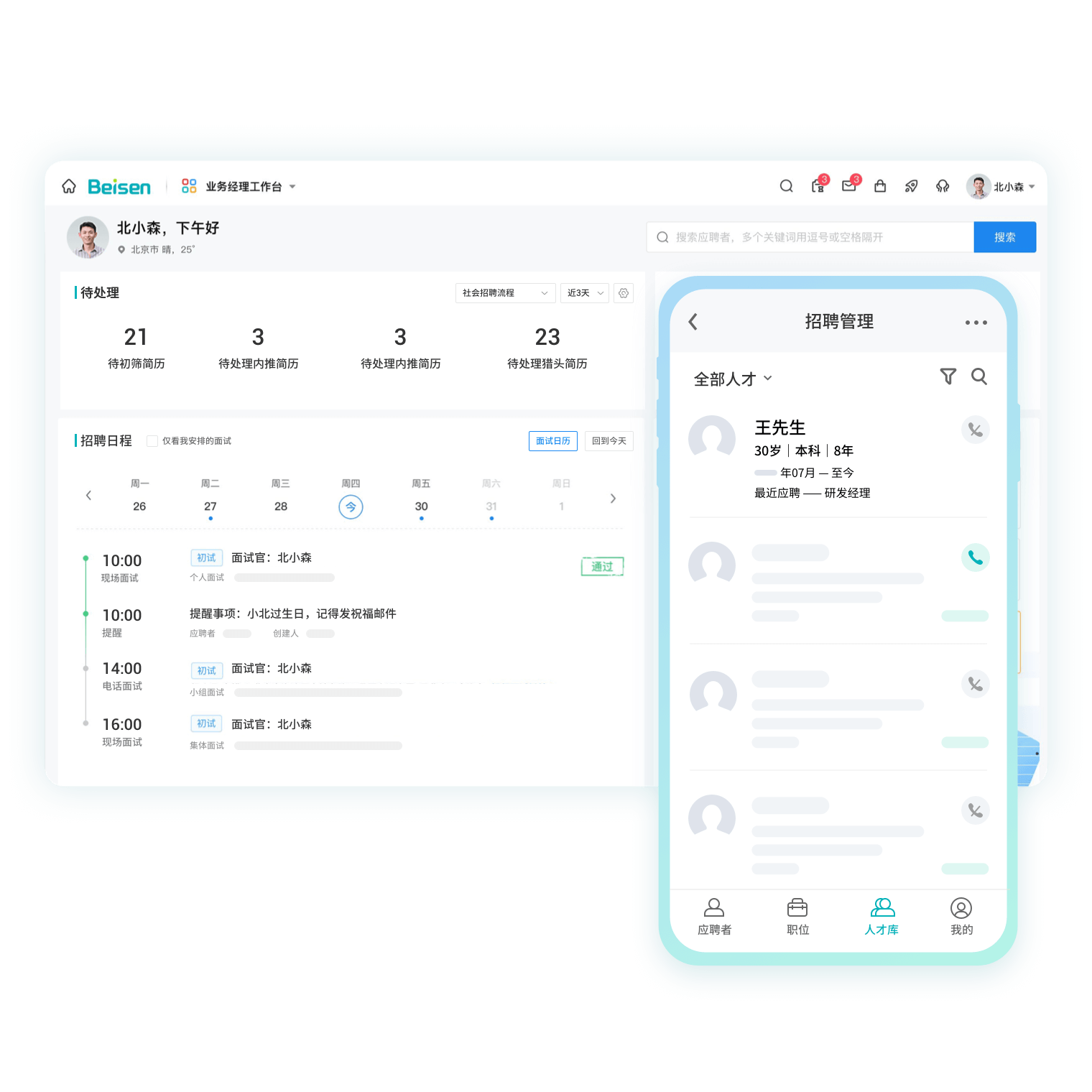 应聘者、面试官、HR、各级领导等招聘角色协作打通,结合在线测评、AI面试、简历解析等技术,实现招聘流程高效流转