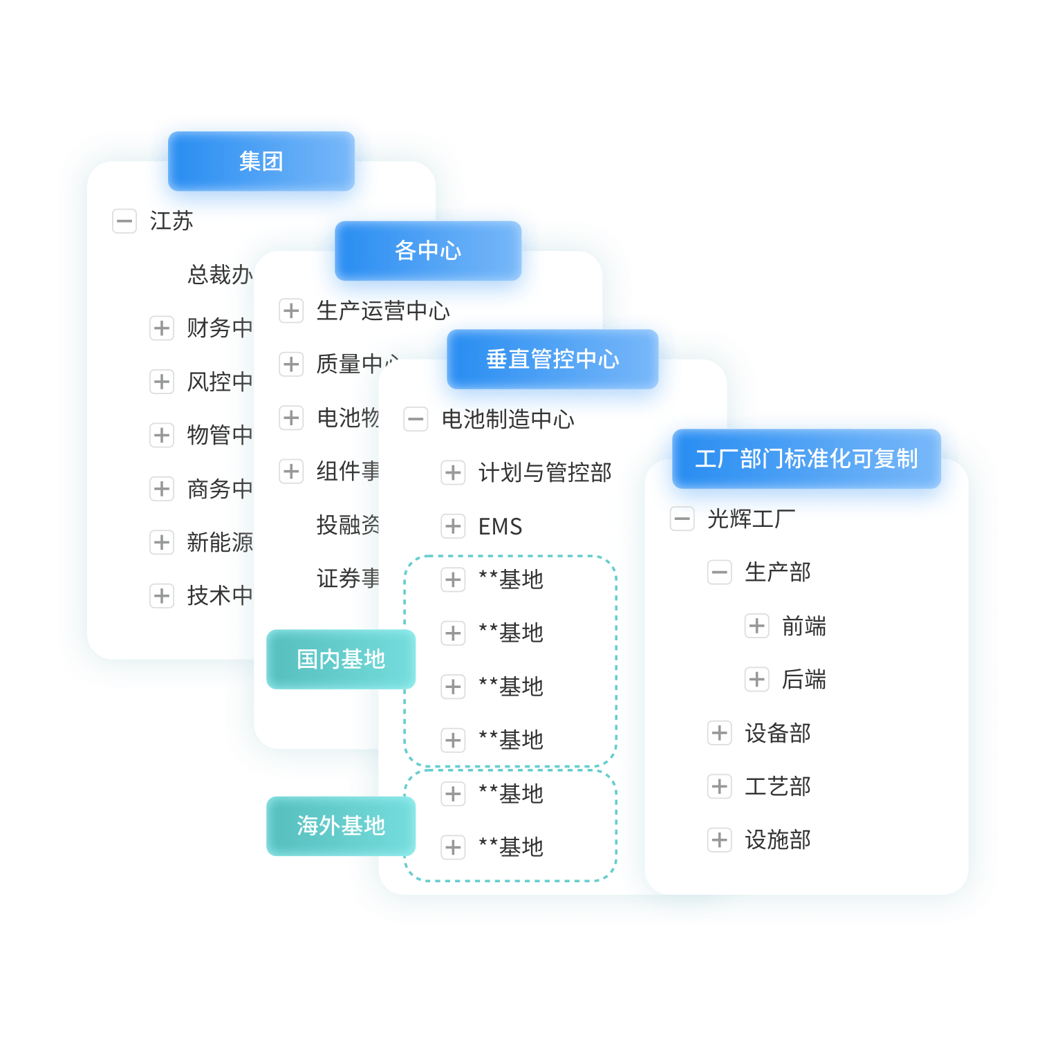 支持“集团-产业/区域-基地”复杂组织管控,管控至车间、工序级;适用HR三支柱模式;支持多维/矩阵组织及兼职等多样化管理