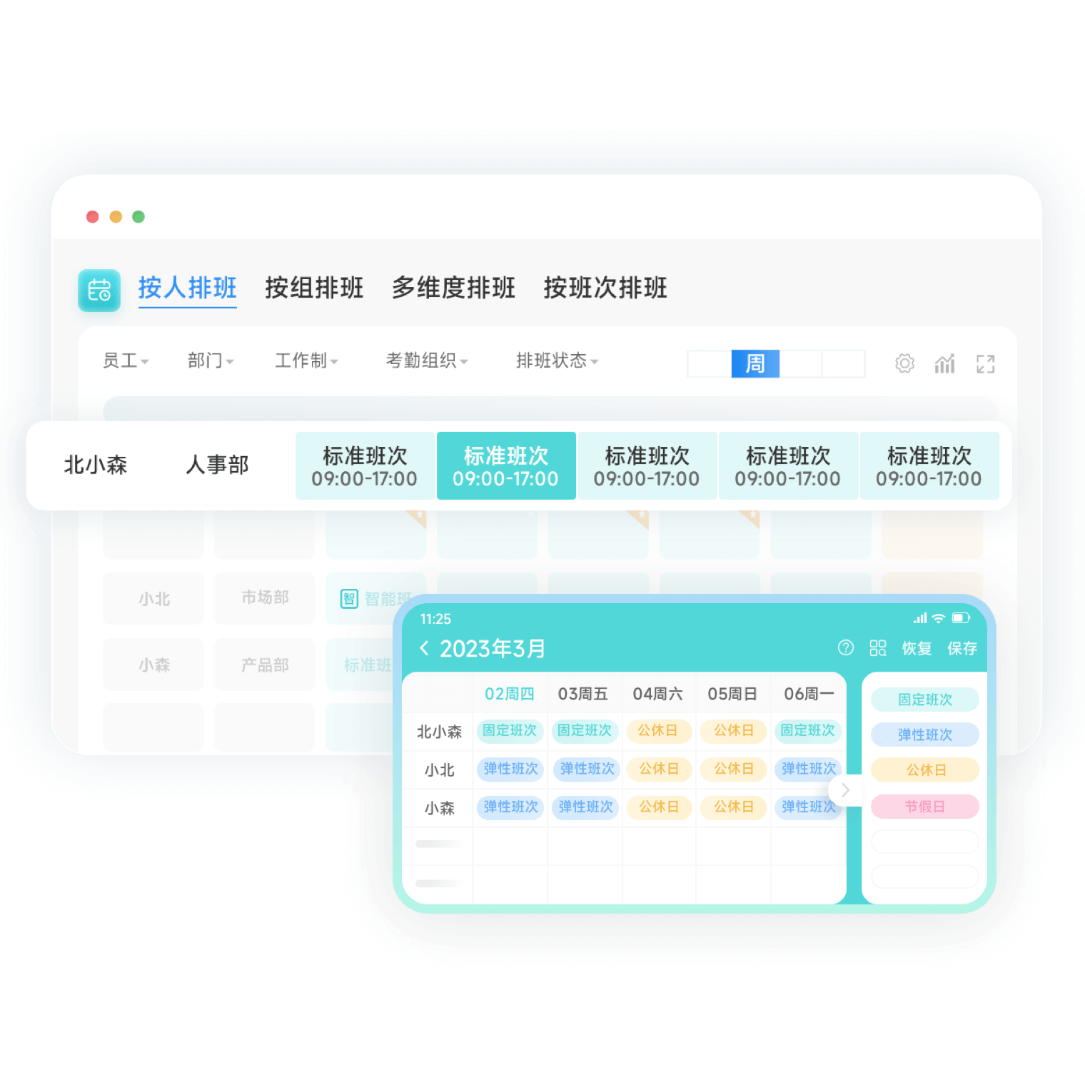 支持做六休一、三期员工排班、工时超额、3天旷工等提醒,确保考勤合规