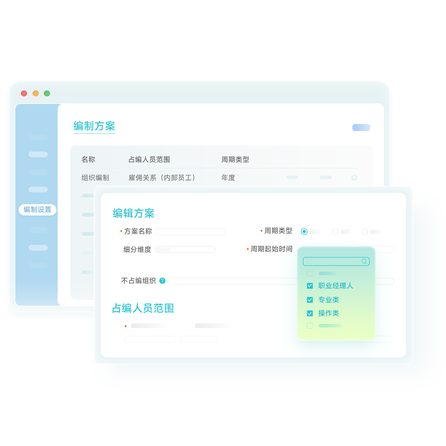 不同组织下的职务、职位、人员类别、用工形式等细分维度,可实现强或弱的编制控制