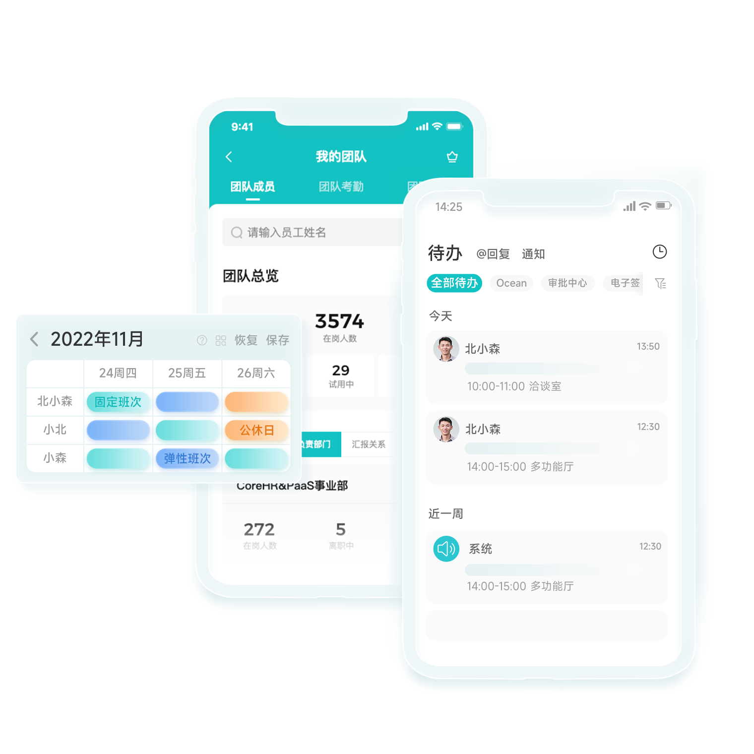 支持新员工融入辅导,目标对齐、任务跟踪、激励反馈、绩效打分、考勤看板、请假加班等审批,帮助业务经理用好人