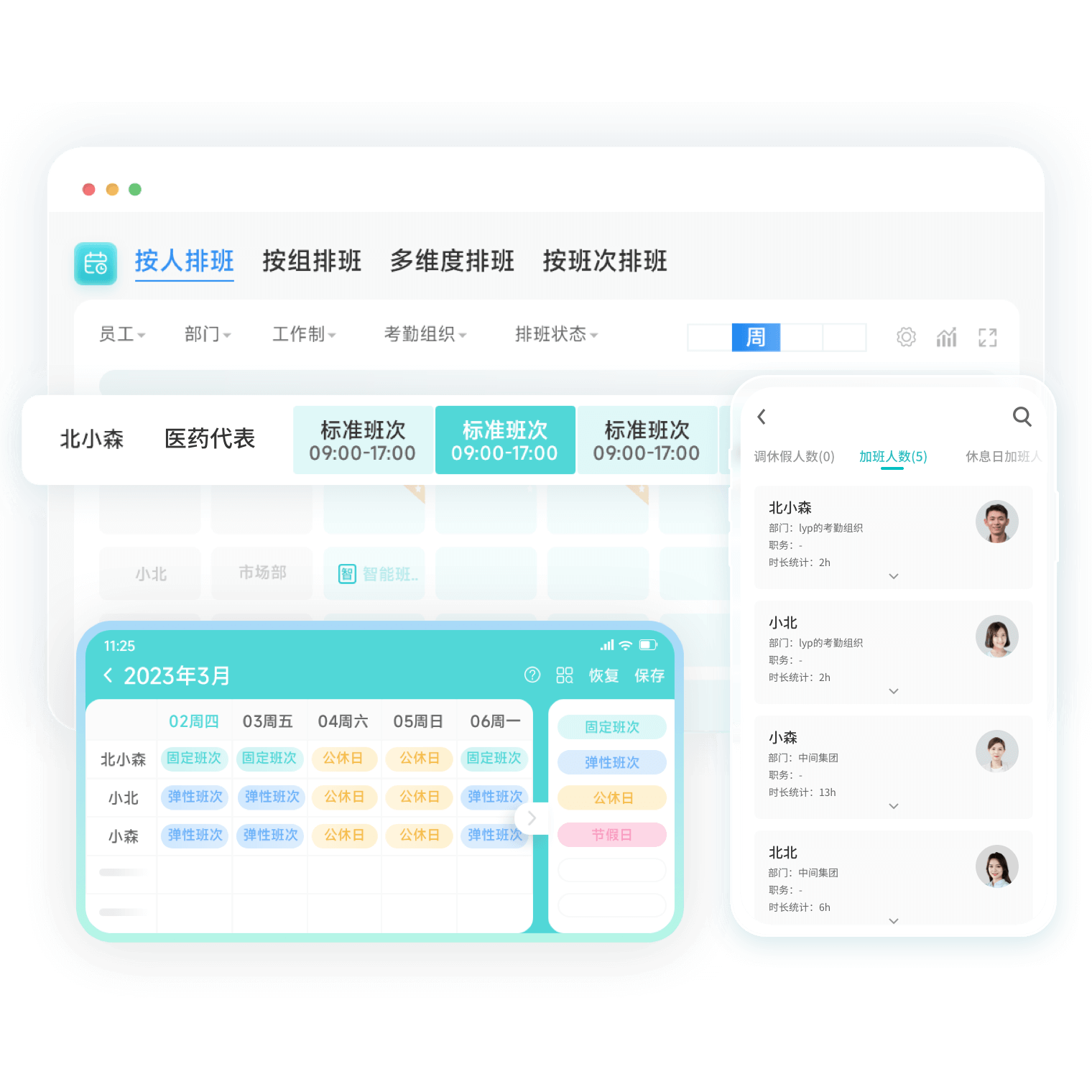 根据业务需求灵活按组、模板、循环、多维度等方式排班,系统自动化合规性校验,排班计划与打卡数据自动比对
