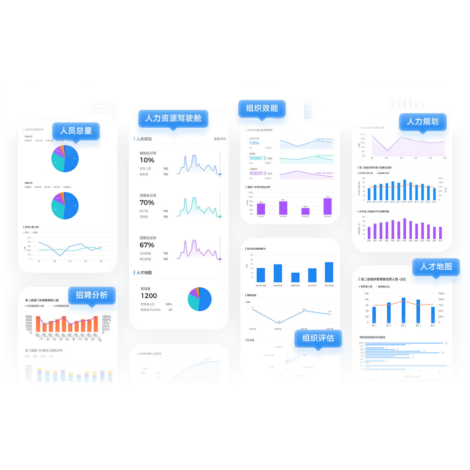 基于业务成功实践,系统预置百余张主题分析,如人员总量、人员配置、组织效能、组织诊断、人才地图、人力规划等